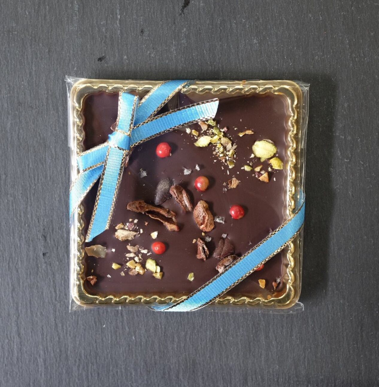 カカオニブス、岩塩、ピンクペッパー、砕いたピスタチオをトッピングしたマンディアンはショコラの甘みと塩味やピンクペッパーの香りがベストマッチングし、男性やワインのお供としても大変人気です。